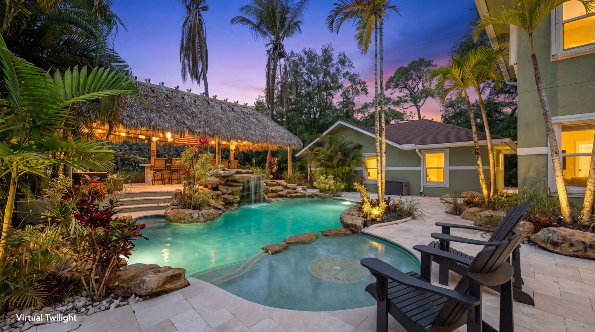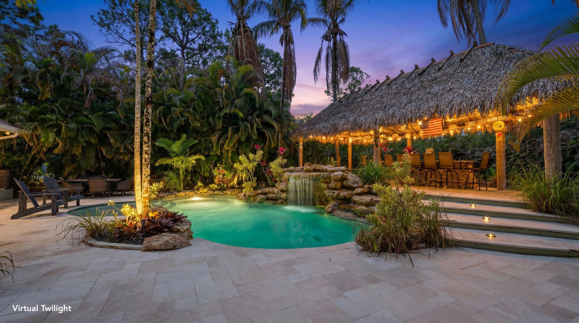 Discover your peaceful retreat in Jupiter Farms-a stunningly remodeled two-story home on 1.25 fenced acres. Featuring impact windows and doors on the first floor and detached garage for hurricane protection. Inside offers bright open-concept living ideal for families. Outside enjoy a resort-style pool with tumbled marble deck and lush landscaping, plus a tiki outdoor kitchen with granite bar, grill, pizza oven, sink, fridge and seating for 12. Includes screened front patio, fire pit, air-conditioned detached garage with livable potential and 30 & 50-amp hookup pad for boat or RV. Minutes from beaches, boating, shopping, fine dining, and great schools. Don't miss this Jupiter Farms gem.